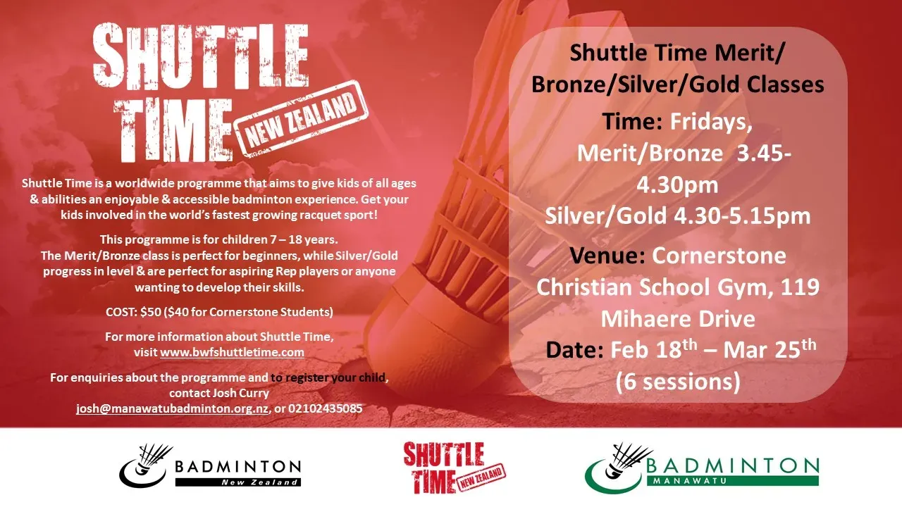 If you would like us to run sessions in your school, please contact Josh Curry at shuttletime@manawatubadminton.org.nz